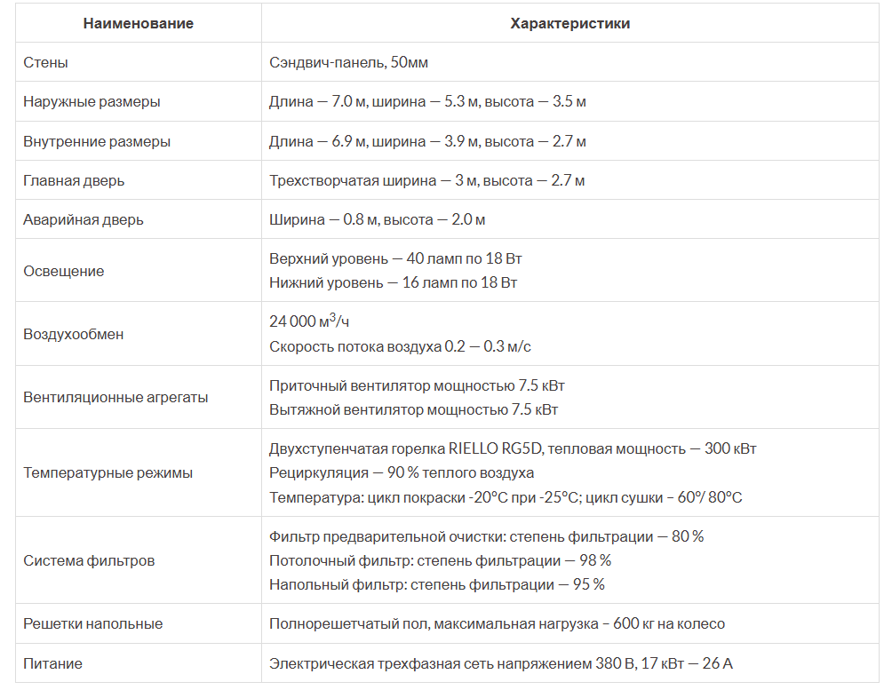 Система фильтров состоит из: потолочного фильтра (степень фильтрации 98 %), напольного фильтра (степень фильтрации 95 %) и фильтра предварительной очистки (степень фильтрации 80 %). Потолочный фильтр состоит из 6-и фильтров, которые монтируются над несущей рамой, выполненной из стали и покрашенной порошковым покрытием. Напольный фильтр состоит из 5-и частей и 2-х выпускных фильтров. Верхнее освещение камеры Guangli GL3 LUX состоит из 10 плафонов, каждый плафон состоит из 4 ламп по 18 Вт. На данной модели используется дополнительное боковое освещение, оно включает в себя 8 плафонов, в каждом по 2 лампы мощностью по 18 Вт каждая. Блок управления и его компоненты импортного производства (Mitsubishi, Omron), они защищены от перегрузки, перегрева, пропадания фазы и от фазовой синхронизации, мотор с Y/Δ запуском. При истечении заданных значений времени, работа Guangli GL3 LUX автоматически прекращается. Покраска происходит при постоянной температуре. Питание камеры осуществляется посредством трёхфазной сети с напряжением 380 В, мощность установки 17 кВт.