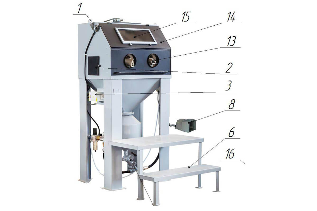 В процессе обработки абразивная взвесь падает через решетчатый настил в бункер камеры. Когда работа закончена, оператор отжимает педаль, подача абразива прекращается и камера разгерметизируется.